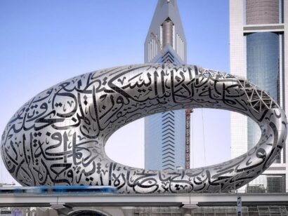 • BẢO TÀNG TƯƠNG LAI do kiến trúc sư Shaun Killa thiết kế và được Tổ chức Tương Lai Dubai ủy quyền. Đây là một trong những công trình độc nhất tại Dubai, có 7 tầng, cao 77m, thiết kế hình elip và được trang trí bởi 14.000m thư pháp Arab trên nền thép không gỉ. (chụp ảnh bên ngoài)