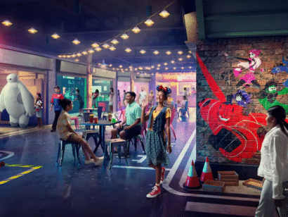 - San Fransokyo Street, được thiết kế giống như một khu chợ đường phố nhộn nhịp, với vô số trò chơi tương tác, hoạt động, cửa hàng, rạp chiếu phim và nhiều hơn thế nữa.